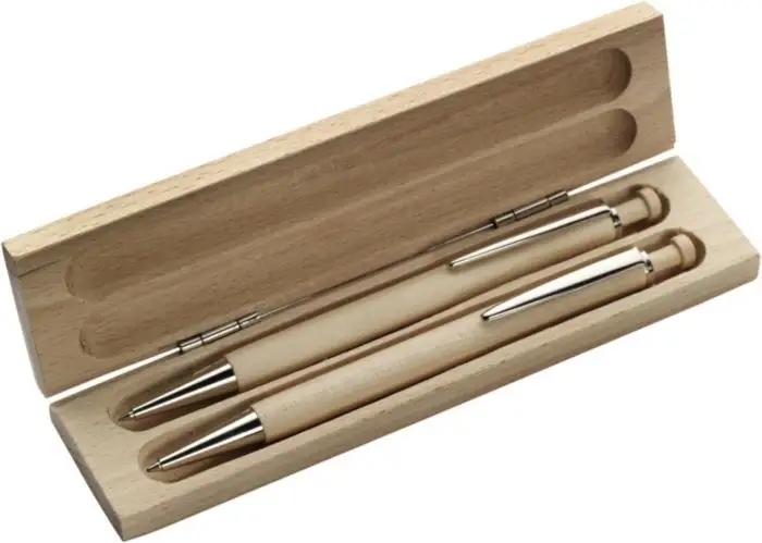 Description Parure de stylo bille et porte-mine en bois et métal dans un écrin en bois, mine Bleue. |