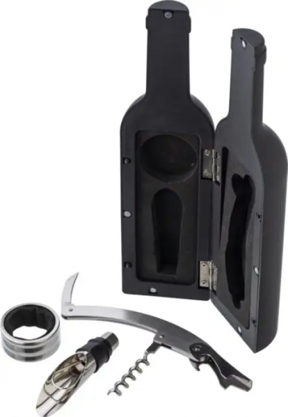 Description Set à vin en ABS contenant un tire-bouchon, un bec-verseur avec bouchon et un stop-goutte. |