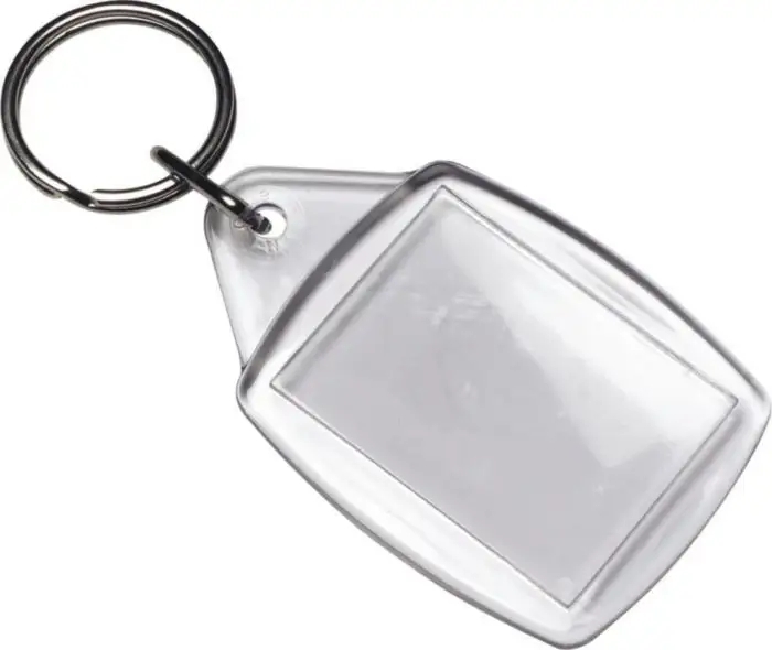 Description Porte-clés en plastique translucide. Le marquage est réalisé sur un insert papier. |