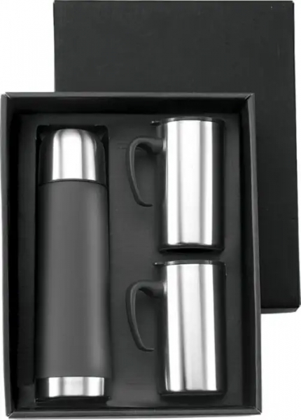 Description Boîte cadeau contenant une bouteille isotherme double paroi en acier inoxydable d'une contenance de 50cl et 2 mugs de 30 cl en acier inoxydable. |