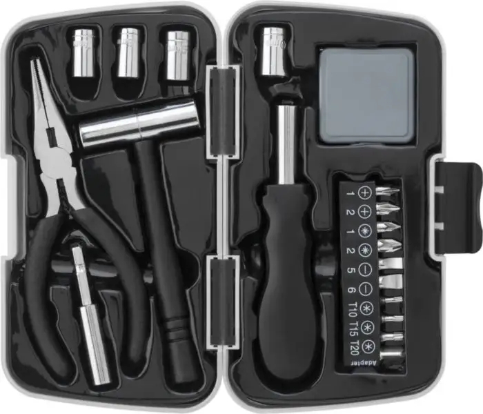 Description Boîte à outils de 19 pièces comprenant tournevis, pince et embouts dans une boîte en plastique. |