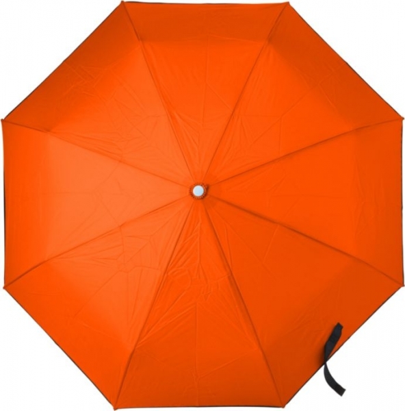 Parapluie pliable en polyester pongée 190T avec fermeture et ouverture automatiques, mât en métal, baleines en aluminium, manche en plastique, livré avec une housse en nylon.
