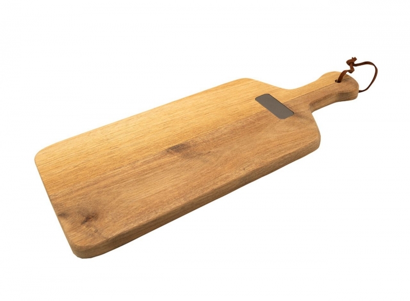Description Acacia massif. Plaque en métal finition titane. Lien en similicuir. Peut aussi servir comme planche de présentation. |