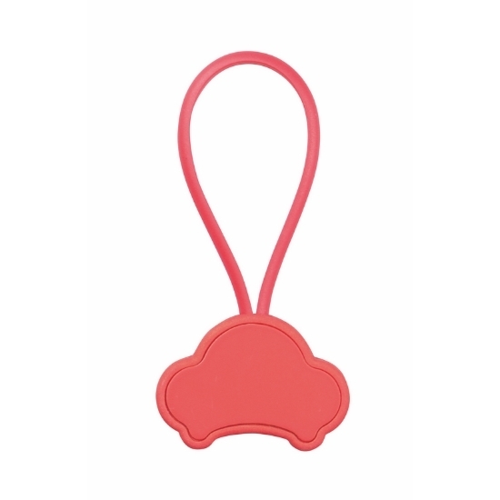 Porte-clé en aluminium en forme de voiture. Finition des bords et cordon pour accrocher les clés, en silicone. Présenté dans une boîte en carton noire.