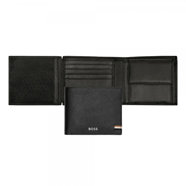 Description Ce portefeuille trifold doté d'une pochette à monnaie est fabriqué en cuir texturé noir de première qualité soigneusement sélectionné. Il est orné d'une luxueuse plaque de signature BOSS chromée et d'une doublure intérieure monogrammée. Cette version emblématique se distingue également par le drapeau tricolore en textile qui orne tous les articles de cette série Le portefeuille comprend : 2 compartiments à monnaie 8 emplacements pour cartes 3 compartiments latéraux 1 fente pour la monnaie Conformément à l'ADN de la marque BOSS, il est simple, fonctionnel, élégant et minimal. |