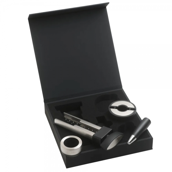 Description Le design simple et épuré des 4 accessoires dédiés au vin de la collection Distinct de HUGO BOSS, signe des lignes fuselées, et reflète l'idée d'une élégance et d'une perfection minimaliste. Ce coffret comprend un coupe papier, un bouchon, un anti-goutte, et un tire-bouchon. Il sera apprécié des amateurs de vin, qui aimeront aussi son joli coffret siglé HUGO BOSS. |